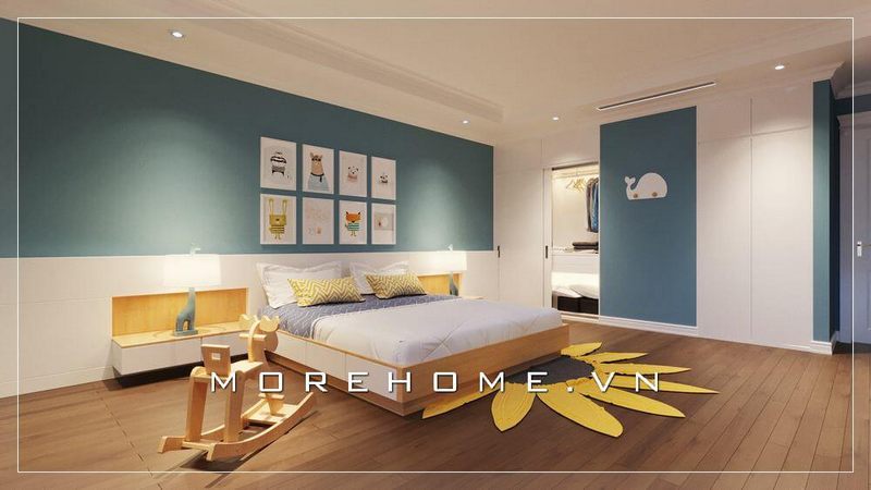 Thiết kế nội thất phòng ngủ trẻ em hiện đại với sự kết hợp hoàn hảo của tủ quần áo màu trắng, tủ quần áo gỗ công nghiệp...