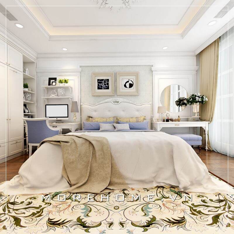 Trang trí nội thất phòng ngủ Master phong cách tân cổ điển đầy sang trọng, nội thất gỗ tự nhiên màu trắng ấn tượng kết hợp sàn gỗ màu nâu trầm tạo cảm giác ấm áp cho không gian nghỉ ngơi của gia chủ