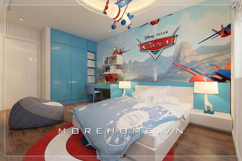 Mẫu thiết kế phòng ngủ bé trai hiện đại và tiện nghi với nội thất gỗ công nghiệp cao cấp và cách tạo các hình khối hình họa về nước pháp đẹp từ giấy dán tường ấn tượng cho phòng của con