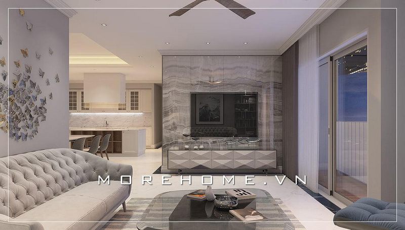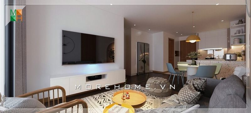 Mẫu thiết kế phòng khách đơn giản nhưng hiện đại, không quá cầu kỳ nhưng đủ để gây ấn tượng cho bất cứ vị khách nào khi bước vào ngôi nhà của bạn. Với thiết kế tivi treo tường độc đáo, ốp tường gỗ kết hợp cùng đá ốp vân mây tạo nên không gian phòng khách trẻ trung mà ấn tượng, nội thất không quá nhiều mà vẫn đầy đủ công năng sử dụng
