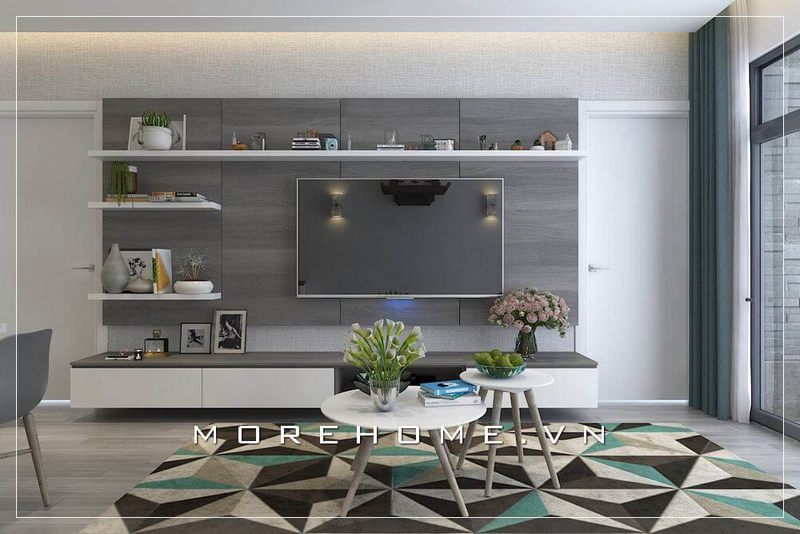 Kệ trang trí kết hợp với kệ tivi treo tường bằng gỗ công nghiệp mang đến sự khác biệt và ấm cúng hơn cho không gian phòng khách nhà bạn.
